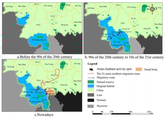 According to the census data, the population of wild elephants in China has increased from just over 100 in the 1980s to over 300 today; that is, their population size more than doubled. They are mainly distributed in areas around Xishuangbanna Dai Autonomous Prefecture, Pu’er City, and Lincang City [8,9]. In recent years, the habitat of these elephants has been somewhat restricted due to urbanization, population growth, and infrastructure development. Simultaneously, with the strengthening of elephant protection measures, the number of wild populations has increased annually, reaching a relatively saturated state. Coupled with food shortages, this has prompted herds to migrate and establish new habitats [10]. In May 2021, a group of elephants migrated northward from their original habitat to areas that had not observed elephants for centuries, finally reaching the Jinning District of Kunming City, Yunnan Province and eventually returning to Pu’er City more than half a year since the beginning of Northward migration of the Asian elephant group. This event attracted the attention of experts and scholars at home and abroad [11]. It is no coincidence that elephant herds have left their original habitats [11]; the “Yunnan north-migrating elephant herd” is a representative event of elephant herds leaving their original habitats, and their increasing number of migrations as well as anthropogenic disturbance and habitat degradation are considered to be important factors. It is essential to study elephant herds that leave their original habitats in order to protect and manage the elephants and their habitats [10]. According to historical documents and investigations, this example of elephant herds leaving their original habitats is not unique or likely to be a random occurrence; since the 1990s, when it was observed that the elephants started to return to Pu’er, the migration of the elephants has shown a long-term continuous trend of moving northward (Figure 1) [11].