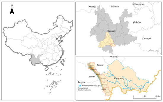 The Asian elephant, Elephas maximus, is the most representative umbrella species in tropical forest ecosystems and is listed as an endangered (EN) species by the International Union for Conservation of Nature (IUCN) and protected by the law [1]. At the same time, elephant conservation, management, and research are being conducted in response to the 15th United Nations Convention on Biological Diversity, known as the Kunming Declaration. Its habitat range is substantially influenced by topography and vegetation type [2,3]. The most suitable habitat for Asian elephants is low-altitude river valleys, and areas rich in tropical plants are their preferred habitat [4]. Currently, the main threats to the survival of wild Asian elephants are habitat fragmentation and a reduction in suitable habitat, which are all caused by human activities [5,6]. Therefore, in order to better protect elephants, state workers have taken measures such as establishing nature reserves, building wildlife corridors, setting up breeding bases, building food source bases, and so on, with some promising results [7].