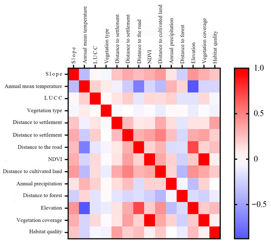 To search the literature related to habitat studies on Asian elephants, after selecting the habitat evaluation factors with a high frequency of occurrence, the data of the above 14 environmental variables (Table 2) were subjected to Spearman’s correlation analysis using SPSS.27 software due to the strong correlation between the environmental factors [15]. This was performed to avoid overfitting the model due to multicollinearity among the environmental variables. After removing the vegetation cover factor, the remaining 13 environmental variables were simulated for subsequent optimization (Figure 3) [16]. The data of the 13 environmental factors were transformed into a raster dataset with a resolution of 30 × 30 m using ArcGIS 10.8.1 and converted into the ASCII format for MaxENT modeling operations.