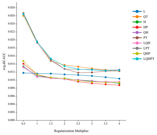 The MaxEnt model is a major research method that can accurately and reliably simulate species distributions by relying only on species’ active sites and environmental data. It has been widely used because it has demonstrated an excellent predictive ability over other models in species distribution studies [20]. The two most critical parameters of MaxEnt are feature combinations and regularization multipliers. Optimizing these parameters can significantly improve the model’s prediction accuracy [21,22,23,24]. In this study, the author utilized the ENMeval package in R to optimize environmental factors. The multiplier level parameter in the model was set to a range of 0.1 to 4, totaling 40 [23,25,26]. There were five feature combination parameters: L for Linear, Q for Quadratic, H for Hinge, P for Product, and T for Threshold, which could produce 29 different combinations [25,26]. In this study, the data package was set from 0.5 to 4, with an increase of 0.5 each time, totaling 12 tuning frequencies and 10 feature combinations, namely, L, QT, H, HP, PT, QH, LQH, LPT, QHP, and LQHPT. The ENMeval package validated these 120 parameter combinations [23,27].