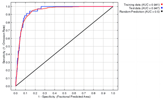 Verification of ROC curve of prediction results of the evaluation of the elephants’ habitat by the MaxEnt model.