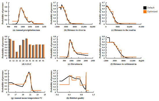 Factor analysis of primary and secondary environmental variables. Based on the response curve of the main environmental variables affecting the suitability of the elephants’ habitat (Figure 6), it is evident that the elephants preferred areas with abundant annual rainfall. The most suitable annual precipitation range is between 980 and 1020 mm. They tended to be active in areas closer to water sources, with a probability of appearance of over 50% when the distance to the river (b) was less than 2.5 km. This probability was negatively correlated with the distance to the river, meaning that the farther the location from the river, the lower the probability of the appearance of elephants. Furthermore, when the distance to the road (c) exceeded 1.5 km, the probability of elephants’ appearance gradually decreased. The response curve of the habitat quality factor fluctuated greatly. In the response factor curve (d) of land use, it can be observed that elephants often appeared in other forest lands, paddy fields, and sparse forest lands. The probability of elephants’ appearance in high-coverage grasslands was above 0.5, followed by rivers, reservoir pond pits, and urban lands.