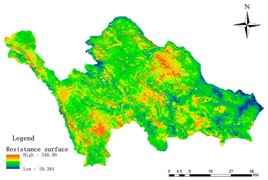 Construction of resistance surfaces. Using the raster calculator of ArcGIS 10.8.1, nine environmental factor resistance surfaces, such as elevation, slope, NDVI, land use, etc., were obtained for Asian elephant dispersal, and finally, the integrated minimum resistance surface for Asian elephant dispersal was generated (Figure 7). It can be seen that Jiangcheng County has a relatively high integrated resistance surface resistance value of more than 19 due to the survival and migration of Asian elephants [30].