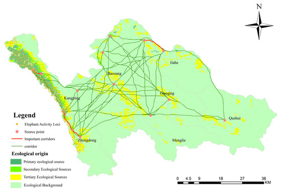 Construction of ecological corridor. According to the habitat suitability for Asian elephants in Jiangcheng County, a total of 14 ecological source areas with a total area of 437.33 km2 were identified, of which the largest first-level ecological source area, with a total area of 108.167 km2, was mainly concentrated in Kangping Township. Through the corridor analysis, three important Asian elephant ecological corridors and 89 general ecological corridors were obtained; the longest corridor of the important corridors was mainly in Kangping Township and Zhenggang Township, and the remaining 89 general potential corridors were mainly concentrated in the four townships of Kangping, Zhenggang, Baozang, and Jiahe (Figure 8). These migration paths link the townships and, together, constitute the ecological corridors for Asian elephant migration in Jiangcheng County.