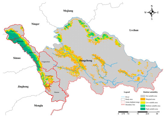 This study utilized the maximum entropy model in conjunction with elephant activity point data and various environmental factor data to analyze and evaluate the habitat suitability for the elephants’ activity in Jiangcheng County. This study draws several conclusions.