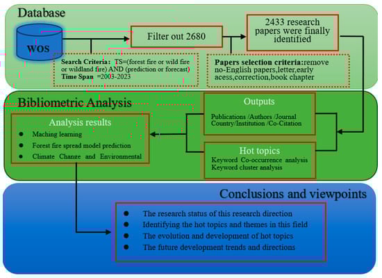 Web of Science is an internationally recognized database of scientific and technical literature known for its rigorous research standards. The Web of Science Core Collection, a compilation of research source databases, was used for the search. The search query used was “TS = (wildland fire OR wild fire OR forest fire) AND (prediction OR forecast)”, aiming to encompass a wide range of wildland fire prediction research, including forest fires, grassland fires, and tundra fires, where “TS” represents the subject. Data were retrieved on 1 April 2024. The selection criteria for literature were as follows: only “article”-type literature written in English was included, excluding news, notices, and other non-relevant literature. Following screening, a plain text file named “download” was exported. The obtained articles were then processed using CiteSpace software (version 6.1.6), yielding a dataset of 2433 articles.
