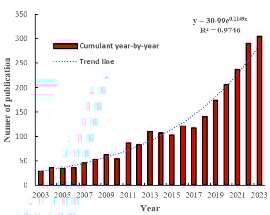 Number of publications in each year from 2003 to 2023.