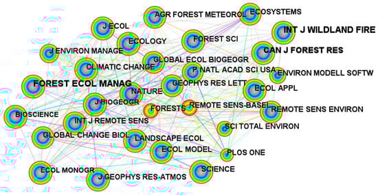 An analysis conducted using data from the Web of Science database revealed that the International Journal of Wildland Fire, with 208 publications, ranks as the leading journal in the domain of wildland fire prediction, followed closely by Forest Ecology and Management (122 publications), Remote Sensing (104 publications), Forests (95 publications), and Fire (80 publications). According to Figure 3, these journals collectively make significant contributions to the field and demonstrate substantial academic engagement. Beyond journals specifically dedicated to wildland fire and forestry topics, Remote Sensing (ranked third) and Remote Sensing of Environment (ranked seventh) feature prominently among the top ten journals by publication volume. Notably, Remote Sensing of Environment is recognized as the premier journal in the realm of remote sensing research. Further insights emerge from utilizing the “Cited Journal” functionality within CiteSpace software, which indicates that the International Journal of Wildland Fire is the most frequently cited journal in the field (1397 citations), trailed by Forest Ecology and Management (1256 citations), the Canadian Journal of Forest Research (919 citations), Science (764 citations), and Ecology (745 citations). Collectively, these five journals exert considerable academic influence in wildland fire prediction studies.