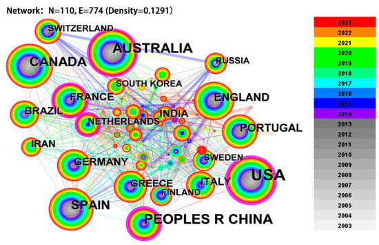 This analysis encompasses data from 110 countries to determine which nations significantly contribute to wildland fire prediction research. Figure 4 visualizes the publication output by country, where “N” represents nodes and “E” denotes links. “Density” is used to indicate the connectivity level between nodes, with larger nodes depicting a higher volume of publications. Nodes highlighted with purple outlines indicate high betweenness centrality, signifying the frequency at which a node serves as a bridge along the shortest path between two other nodes. The density of these lines reflects the strength and frequency of collaborative research between countries. The data reveal that the United States, China, Australia, Canada, and Spain are the top five publishing countries. Notably, Australia, the United States, and Canada have particularly dense networks of collaboration, underscoring their crucial roles in advancing global wildland fire prediction research.