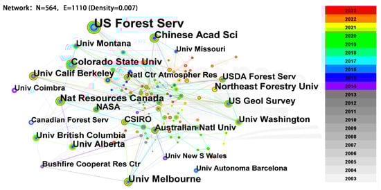 Institutional research depth in the domain of wildland fire prediction varies significantly across different countries, demonstrating a rich tapestry of global contributions. Using CiteSpace software, we constructed a network collaboration map (Figure 5) of institutions involved in wildland fire prediction, comprising 564 nodes and 1110 links, with a network density of 0.007. The analysis identifies the US Forest Service, the Chinese Academy of Sciences, the University of Melbourne, Natural Resources Canada, and Colorado State University as the leading institutions by publication volume. Among these, the US Forest Service holds considerable influence, highlighting its central role in advancing research and knowledge in wildland fire prediction.