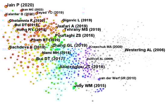 Co-citation analysis, facilitated by software like CiteSpace, provides a valuable method for examining relationships within a field of research. Co-citation occurs when two or more publications are jointly cited by subsequent works, indicating a potential intellectual connection. By visualizing these relationships as networks, researchers can trace the evolution of a field, identifying influential publications and emerging trends. Figure 6, generated using CiteSpace, depicts the co-citation network for wildfire prediction research. Each node represents a publication, with node size correlating to co-citation frequency. The color gradient, progressing from gray to purple, blue, and ultimately red and orange, reflects both the publication’s temporal placement (2003–2023) and its citation frequency, with red signifying the highest. The graph demonstrates a rising trend in citation frequency from 2003 to 2023, peaking in 2019 and 2020. Table 4 lists the top 10 most frequently cited papers, showing that the paper by Jain (2020), with 65 co-citations, emerges as the most frequently cited, significantly impacting wildland fire prediction research. As a review paper and the earliest cited paper in the year, it provides a comprehensive and in-depth overview of machine learning methods for wildland fire prediction, offering significant guidance and theoretical implications for the subsequent application of machine learning in wildland fire prediction research [].