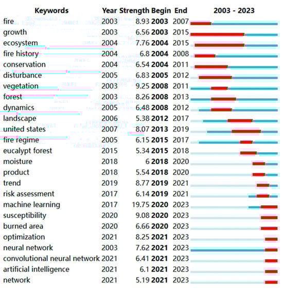 Using CiteSpace software’s co-word analysis feature, burst keywords are identified as those experiencing a rapid increase in citation frequency within a specific timeframe. These keywords offer insights into emerging trends and dynamic changes in a research field during that period. We set the parameter to ‘Burst terms’ in CiteSpace to generate a keyword burst map covering wildland fire prediction research from 2003 to 2023 (Figure 9). The burst strength of a keyword, indicating the magnitude of its citation frequency, represents its influence, with higher values denoting greater impact.