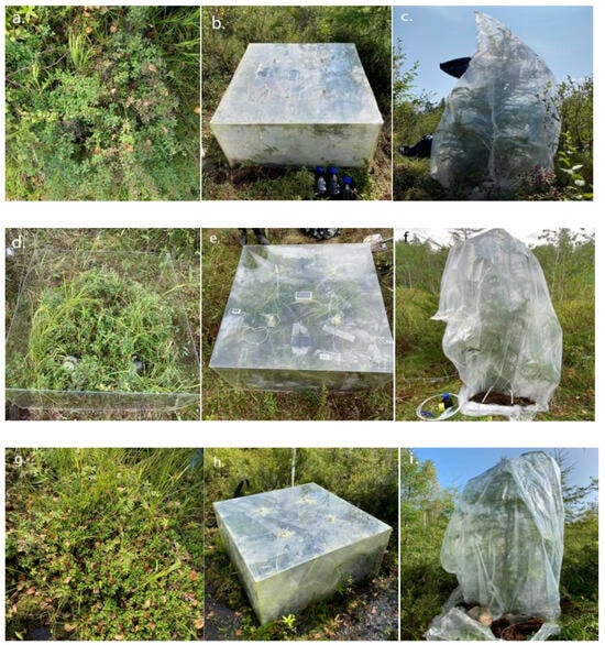 Field in situ labeling experiments: Yichun (a). V. uliginosum, C. schumidtii, and Sphagnum unmarked; (b). V. uliginosum, C. schumidtii, and Sphagnum marked; (c). L. gemlini marked; Heihe (d). V. uliginosum, C. schumidtii, and Sphagnum unmarked; (e). V. uliginosum, C. schumidtii, and Sphagnum marked; (f). L. gemlini marked; Mohe (g). V. uliginosum, C. schumidtii, and Sphagnum unmarked; (h). V. uliginosum, C. schumidtii, and Sphagnum marked; and (i). L. gemlini marked.