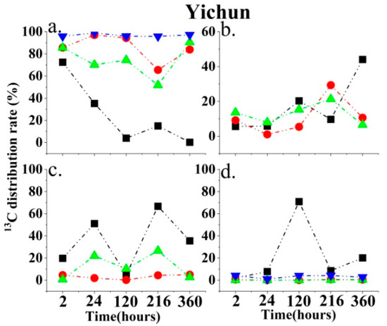 The plant roots, stems, leaves, and soil of the labeled samples and control samples were collected 2, 24, 120, 216, and 360 h after the end of labeling. Three parallel samples were collected from each sample site. The sample was freeze-dried and pulverized with a ball mill. 13C isotope values of plant and soil samples were determined using IsoPrime-IRMS. The soil organic carbon (SOC) content was determined using the potassium dichromate oxidation method. Take 0.2 g of air-dried soil and add 10 mL 0.4 mol/L potassium dichromate sulfuric acid solution into the deboiling tube, deboil at 180 °C for 10 min, then transfer to a conical bottle after cooling, add 3–5 drops of phenanthroline indicator, and titrate with 0.2 mol/L ferric sulfate solution. The color changes from orange-yellow to blue-green to brick red, and brick red is the end point of the reaction. Total nitrogen (TN) was determined using the Kjeldahl method. Weigh 1 g air-dried soil and transfer it to the bottom of the Kjeldahl flask, add 2 g mixed catalyst, shake well and add 5 mL sulfuric acid, heat and boil with electric furnace. After boiling for 90 min, take off the Kjeldt flask, add 5 mL boric acid indicator solution into a 150 mL conical flask after cooling, open the condensate water, add 20 mL sodium hydroxide solution through the tee pipe, immediately close the distillation chamber, open the steam clip, and ensure steam distillation. Titrate with a standard solution of hydrochloric acid until the solution changes from blue-green to purple-red as the end point. Total phosphorus (TP) was determined using the perchloric acid–sulfuric acid method. Weigh 1 g of soil sample and place it in a 50 mL triangle bottle, add 48 mL concentrated H2SO2, shake it, and add 10 drops of 70% perchloric acid to shake well. After boiling for 60 min, wash the cooled liquid with water into a 100 mL volumetric bottle. Absorb 2–10 mL of filtrate into a 50 mL volumetric bottle, dilute it with water to 30 mL, add 2 drops of dinitrophenol indicator, and adjust the pH with dilute sodium hydroxide solution and dilute sulfuric acid solution until the solution is just slightly yellow. Add 5 mL of molybdenum–antimony color developer, with the colorimetric at 700 nm wavelength on a spectrophotometer, to read the absorption value. The soil pH and soil moisture content (SWC) were measured using a portable detector. The thickness of the active layer (ALT) was measured with a 1.5 m T-shaped metal rod. Mean annual temperature and precipitation data were obtained from Weather net (https://rp5.ru/, accessed on 25 May 2022). The contents of abscisic acid (ABA), ethylene (ETH), gibberellin (GA), peroxidase (POD), superoxide dismutase (SOD), pyruvate decarboxylase (PDC), ethanol dehydrogenase (ADH), and acetaldehyde decarboxylase (ALDH) in plant tissues were determined by enzyme-related immunoassay [34,35]. The contents of soluble sugar (SS) and starch (ST) were determined by anthrone colorimetry. The soluble sugar and starch in the sample can be separated by 80% ethanol, the starch can be decomposed into glucose by acid hydrolysis, and the glucose content can be determined by the anthrone colorimetric method [34]. Proline (Pro) was determined by ninhydrin colorimetry [34].
