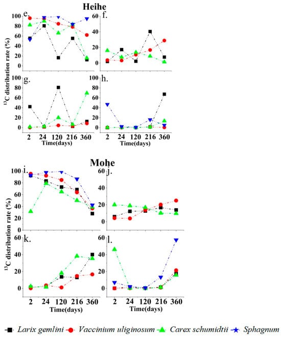 The leaf 13C allocation ratio of the four species in the three permafrost areas was the highest and decreased with an increase in marking time, while the stem, root, and soil increased with an increase in marking time (Figure 3). The leaf 13C allocation of L. gemlini was the highest in Mohe (discontinuous permafrost zone) (Figure 3i) and lowest in Yichun (isolated patches of the permafrost zone) (Figure 3a). L. gemlini had the lowest root 13C allocation at 120 h and the highest soil 13C allocation at 120 h in Yichun. L. gemlini had the highest root and soil 13C allocation at 120 and 360 h, respectively, in Heihe (sporadic permafrost zone). L. gemlini had the highest root and soil 13C allocation at 360 h in Mohe. V. uliginosum had the lowest leaf 13C allocation at 216 h and the highest stem 13C allocation at 216 h in Yichun. C. schumidtii had the highest leaf 13C allocation at 360 h and the highest stem 13C allocation at 216 h; root 13C allocation at 24 and 216 h was higher than at other marking times and soil allocation increased with marking time in Yichun. The 13C allocation in leaves of C. schumidtii was the highest at 24 h, and decreased with marking time in stems, and that in roots and soil increased with marking time in Heihe and Mohe. The 13C allocation of Sphagnum leaves changed little with marking time in Yichun and Heihe and decreased with marking time in Mohe. Sphagnum 13C allocation decreased with marking time in Yichun and Heihe and increased with marking time in Mohe.