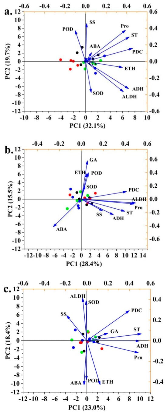 Principal component analysis of plant root signaling substances in peatland under different permafrost areas ((a). Yichun; (b). Hehe; (c). Mohe). ABA = abscisic acid; ETH = ethylene; GA = gibberellic acid; POD = peroxidase; SOD = superoxide dismutase; SS = soluble sugar; ST = starch; Pro = proline; PDC = pyruvate decarboxylase; ADH = alcohol dehydrogenase; ALDH = aldehyde decarboxylase.