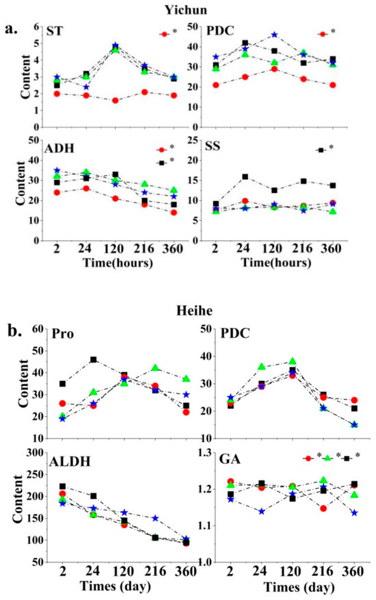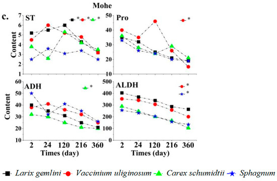 Changes in the major root signaling substances affecting plant growth in different permafrost regions with the marking time ((a) Yichun; (b) Hehe; (c) Mohe). *, p < 0.05 (Tukey’s significant test). SS = soluble sugar; ST = starch; Pro = proline; PDC = pyruvate decarboxylase; ADH = alcohol dehydrogenase; ALDH = aldehyde decarboxylase.