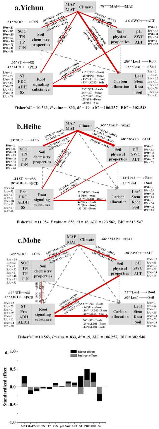 Climate change has indirect effects on plant–soil carbon allocation by influencing soil’s physical properties in Yichun (isolated patches of the permafrost zone) (Figure 6a and Figure 7a). MAP and SWC affected carbon allocation in roots and stems through PDC, and SWC affected the carbon allocation of roots and soil through ADH. MAP affected the carbon allocation of leaf stems and roots through starch, and ALT affected the carbon allocation of roots and soil through SS in Yichun. Climate change had a significant impact on soil’s physical properties and indirectly affected plant–soil carbon allocation by affecting plant root signaling substances in Heihe (sporadic permafrost zone) (Figure 6b and Figure 7b). MAP affected stem and root carbon allocation through PDC, and SWC affected root carbon allocation through ALDH. MAT affected root carbon allocation through soluble sugar, and proline affected leaf and stem carbon allocation through Heihe. Root signaling substances significantly affected plant–soil carbon allocation in Mohe (discontinuous permafrost zone) through the indirect effects of climate change on soil’s physical and chemical properties (Figure 6c and Figure 7c). SOC and SWC affected root and soil carbon allocation through ADH, C:N and ALT affected leaf carbon allocation through starch. Proline affected stem and root carbon allocation, and ALDH affected root and soil carbon allocation in Mohe.