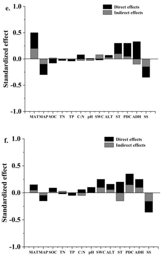 Piecewise SEM was used to evaluate the direct and indirect effects of changes in plant root signals on carbon allocation in different permafrost regions. The width of the arrow indicates the strength of the relationship. Red arrows indicate important paths and dotted arrows indicate non-important relationships (p > 0.1) (a–c). Normalization effects between variables in different permafrost regions (direct and indirect normalization effects) (d–f). MAT = mean annual temperature; MAP = mean annual precipitation; SOC = soil organic carbon; C:N = soil carbon/nitrogen ratio; TN = total nitrogen; TP = total phosphorus; SWC = soil water content; ALT = active layer thickness; SS = soluble sugar; ST = starch; Pro = proline; PDC = pyruvate decarboxylase; ADH = alcohol dehydrogenase; ALDH = aldehyde decarboxylase; AIC = Akaike information criterion; BIC = Bayesian information criterion. R2C (conditional R2) represents the proportion of variance explained by fixed and random effects, R2M (marginal R2) represents the proportion of differences in fixed effect interpretation. * p < 0.05, ** p < 0.01, *** p < 0.001.