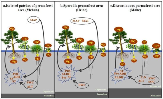 Against the background of global warming, permafrost degradation appears [40,41], which will lead to changes in soil’s physical and chemical properties and affect carbon allocation in the plant–soil system [42], thus affecting carbon cycling in permafrost regions [43,44]. Permafrost degradation manifests itself in the form of thermal collapse [14] and thickening of the active layer [10]. The study of the composition and productivity of plant species after permafrost thawing in the Alaskan tundra shows that the tundra ecosystem is changing to one dominated by shrubs and mosses [45]. Permafrost degradation releases more carbon dioxide than is absorbed by primary productivity and can lead to changes in the structure of the community, which in turn affects the hydrothermal processes in the permafrost and active layers [46]. A study of plant carbon allocation and soil organic matter turnover in Canadian permafrost found that recently synthesized photosynthates drive the mineralization of older SOC under tundra vegetation [14]. Located at the southern edge of the Eurasiatic permafrost, the Xing’an Mountains have three types of permafrost and rich vegetation types. Therefore, permafrost degradation is manifested by differences in latitude and the deepening of the thickness of the active layer [46]. The thickness of the active layer is the main factor affecting the distribution and sum of photosynthetic 13C. The distribution of 13C to the ground is mainly because the discontinuous permafrost area is larger than the island permafrost area [47]. SOC, C:N, ALT, and SWC regulate the allocation of plant carbon by influencing anaerobic metabolites and ST in the discontinuous permafrost region, indicating that root signaling substances in the continuous permafrost region are easily affected by soil’s physical and chemical properties (Figure 7a), which is consistent with the study on the Qinghai–Tibet Plateau [48]. In sporadic permafrost regions, MAP, MAT, and SWC affect plant carbon allocation by influencing anaerobic metabolites and SS, and are regulated by hormones and osmoregulatory substances when resisting anoxia (Figure 7b). These results indicate that the allocation of carbon from the plant soil in the sporadic permafrost region is susceptible to climate change and transient flooding stress. MAP and SWC affect plant–soil carbon allocation by influencing anaerobic metabolites, and MAP and ALT affect carbon allocation by regulating nonstructural carbohydrates in sporadic island permafrost regions (Figure 7c). Therefore, the water content and the thickness of the active layer are the key factors affecting carbon allocation, which is consistent with the findings of the study of the Arctic carbon cycle [49]. Plant–soil carbon allocation in isolated patches of permafrost regions is more susceptible to the indirect and direct effects of many factors. The physical properties of the soil are affected by climate change in sporadic permafrost regions, and the allocation of carbon is regulated by root signaling substances. Carbon allocation in the discontinuous permafrost areas is mainly regulated by root signaling substances that are affected by soil’s physical and chemical properties under climate change. Compared to the sporadic permafrost regions, the carbon allocation in discontinuous and isolated patches of the permafrost regions is more affected by the regulation of root signaling substances. Therefore, the mechanism of the regulation of carbon allocation between plants and soils is affected by permafrost degradation.