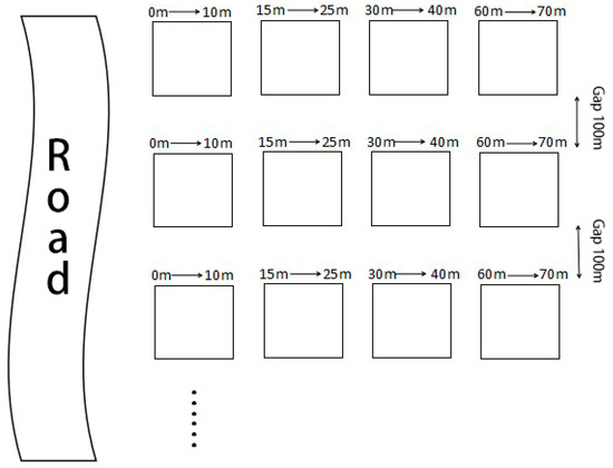 Spatial distribution pattern of Juglans mandshurica seedlings at different distances from road.