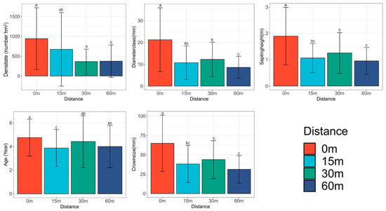 Density, ages, and growth indices of Juglans mandshurica seedlings at different distances from road (a, b, c represent three groups, ab, bc represent two combinations of two independent groups).