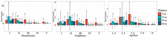 The height classes of the Juglans mandshurica seedlings at different locations from the road have a more consistent trend, except for the forest edge, where the number of class I seedlings (<0.7 m) is low (16%, 12%, and 31%, respectively) and the number of class II seedlings (0.7 m–1.3 m) is the highest (61%, 55%, and 49%, respectively). The number of seedlings decreases rapidly as the height class increases further. The number of class I seedlings was also lower at the forest edge (5%); the numbers of classes II, III (1.3 m–2.0 m), and IV seedlings (2.0 m–3.0 m) were comparable (28%, 27%, and 28%, respectively); and the number of class V seedlings decreased (12%). Class II was higher at 15 m than at other locations, but the difference was not significant, and height classes III, IV, and V (≥3.0 m) were all significantly greater at the forest edge than at other locations, with 66% of young trees at class III and above (≥1.3 m) at the forest edge; 23% at 15 m; 33% at 30 m; and 20% at 60 m (Figure 3).