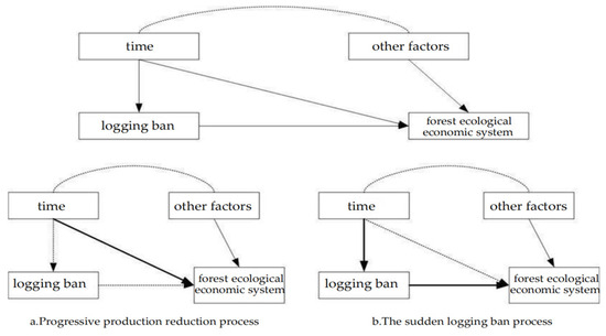 In the process of natural forest resource conservation in China, there are two processes: gradual reduction of production and sudden cessation of logging. Figure 2 illustrates the policy logic of the natural forest resource conservation project. On the one hand, the gradual reduction process of commercial logging of natural forest resources can be traced back to the late 20th century, which is a gradual process (see Figure 2). Since the implementation of the natural forest resource conservation project in China in 1998, the northeastern region of China has begun to transition from a “heavy harvesting and light nurturing” forest management model [49]. On the other hand, for operators, the comprehensive logging ban policy appeared as a “sudden event” (see Figure 2) because the comprehensive logging ban policy was implemented in a sudden and top-down manner, without giving forest resource operators much preparation time [50]. In addition, various other factors, such as resource endowment, capital investment, and social environment, operate independently of the two processes of gradual reduction and the sudden cessation of logging, affecting the operation of the forest ecological economic system.