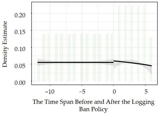 The results indicate that the running variable satisfies the continuity assumption. The probability density for the driving variable hovers between 0.05 and 0.07, with no discernible discontinuity observed either prior to or subsequent to the enforcement of the comprehensive logging prohibition policy (Figure 3). In addition, the t-statistic for the McCrary density test is −0.4792, with a corresponding p-value of 0.6318. This implies that within the 90% confidence interval, we cannot reject the null hypothesis of the running variable’s continuity. Therefore, it cannot be asserted that there is any manipulation of the running variable, allowing for the further estimation of the LATE.