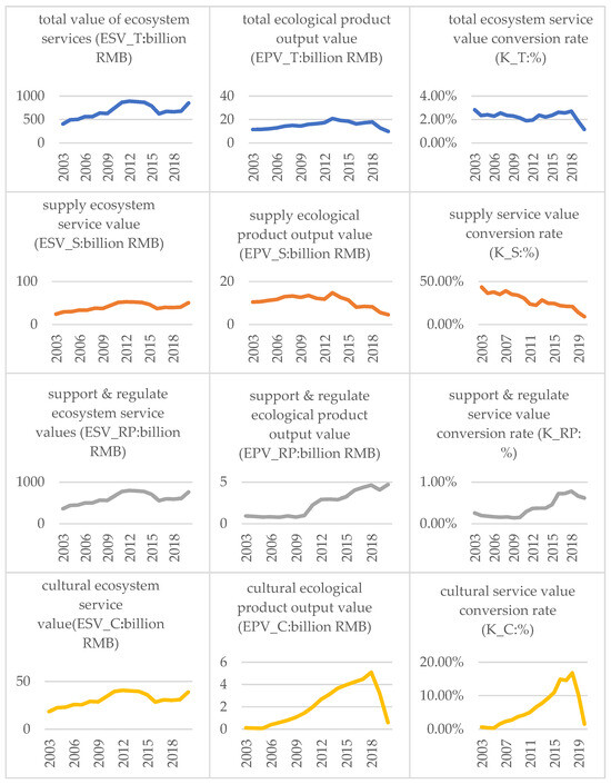 | Degree of transformation of ecological–economic system | Total ESV conversion rate (K_T); supply ecological service value conversion rate (K_S); support and regulate service value conversion rate (K_RP); cultural service value conversion rate (K_C) | The data come from the research of Huang Xianqiao (2024) [54] and are the ratio of the output value of ecological products to the value of ecosystem services. | |