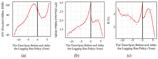 Based on the research design, the SRD is constructed with the year of policy implementation as the cutoff point to estimate the local average treatment effect (LATE) of the comprehensive logging ban policy on ESV, EPV, and K. Figure 5 vividly illustrates the policy intervention effects brought about by the comprehensive logging ban; the implementation of the comprehensive logging ban policy has altered the trend of forest ecological–economic operations. Specifically, the comprehensive logging ban policy has led to positive ecological benefits and negative economic benefits, consequently reducing the realization of ESV into EPV. The results of non-parametric kernel-weighted regression indicate that ESV, EPV, and K all experienced jumps in the year of policy implementation; ESV exhibited a positive jump of approximately 10 units, while EPV and K showed negative jumps of about 2 units. It is evident that the policy intervention effect of the comprehensive logging ban policy primarily manifests in the improvement of ecological benefit.