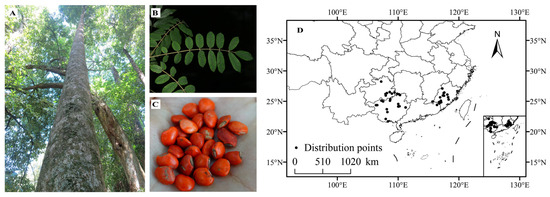 Photos and distribution points of Ormosia microphylla. (A) whole tree; (B) leaves; (C) seeds; (D) distribution points.