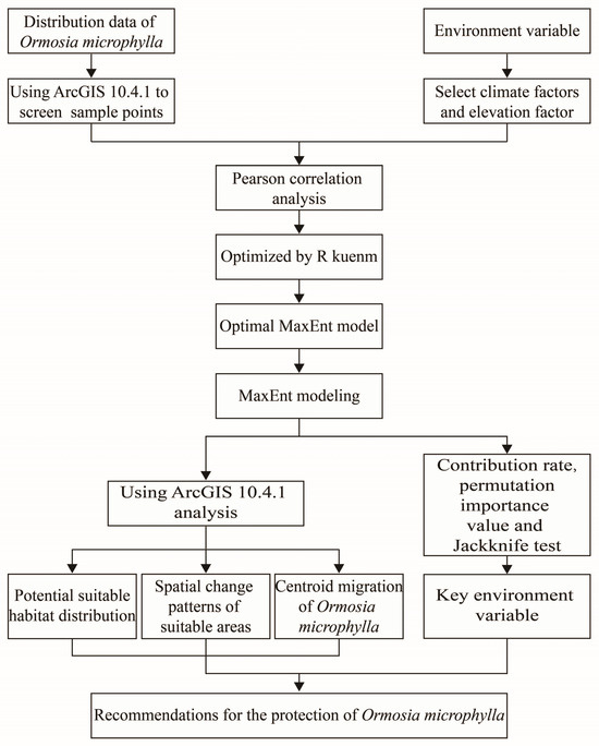 The spatial units with the probability of species existence ≥0.4 were defined as potentially suitable areas and assigned the value of “1”. The spatial units with the probability of species existence <0.4 were defined as non-suitable areas and assigned the value of “0”. These numerical values indicate the existence/non-existence (0, 1) matrix of the potential geographic distribution of O. microphylla in each period. Based on this matrix, the migration pattern of the suitable area for O. microphylla was categorized into three types: increased area, lost area, and reserved area. Here, the matrix value of 0 → 1 was interpreted as an increase in area, 1 → 0 was considered a loss in area, and 1 → 1 was inferred as a reserved area [26]. Finally, the overall change pattern of the O. microphylla distribution area was drawn in ArcGIS 10.4.1 software. At the same time, the suitable area of O. microphylla was regarded as a whole and converted into a centroid in ArcGIS 10.4.1 software, and the migration trend of suitable habitat was evaluated by the change in centroid position in each period. Figure 2 summarizes the analysis process of this study.