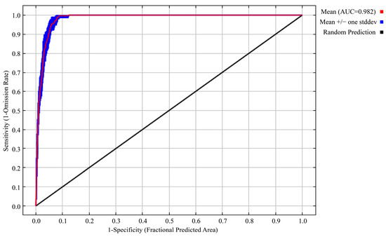 Based on the current 40 distribution information data and nine climate variables of O. microphylla, the kuenm packet was used to optimize the MaxEnt model and to simulate the potential distribution area of O. microphylla. When the feature combination (FC) is product features (P), threshold features (T), and hinge features (H), and the RM = 1.7, delta.AICc = 0, indicating that the parameter combination is the best model. Under the parameter model, the accuracy is tested by the AUC value. The prediction results show that the training AUC values of the model simulation when tested 10 times were all greater than 0.9 (Table 1), and the current average training AUC value reached 0.982 (Figure 3), indicating that the prediction performance of the model was very high.