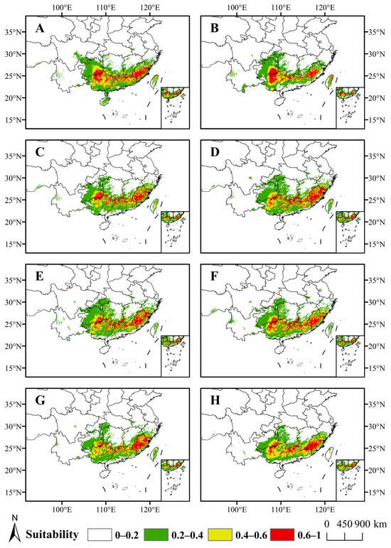 Comparing the LIG, the LGM, and the MH periods, it is observed that the area of highly suitable distribution in the LIG is the largest, approximately 13.87 × 104 km2, which was about 2.46 × 104 km2 and 2.22 × 104 km2 higher than that in the LGM period and the MH. During the LIG, the highly suitable areas were mostly concentrated in Fujian, Guangdong, Guangxi, and southeastern Guizhou. The area of highly suitable distribution area decreased in the LGM, but there was a highly suitable area in the eastern part of Taiwan Province, China. The distribution area of highly suitable areas in the MH was larger than that in the LGM, mainly distributed in Fujian, the Nanling Mountains, and southeastern Guizhou.