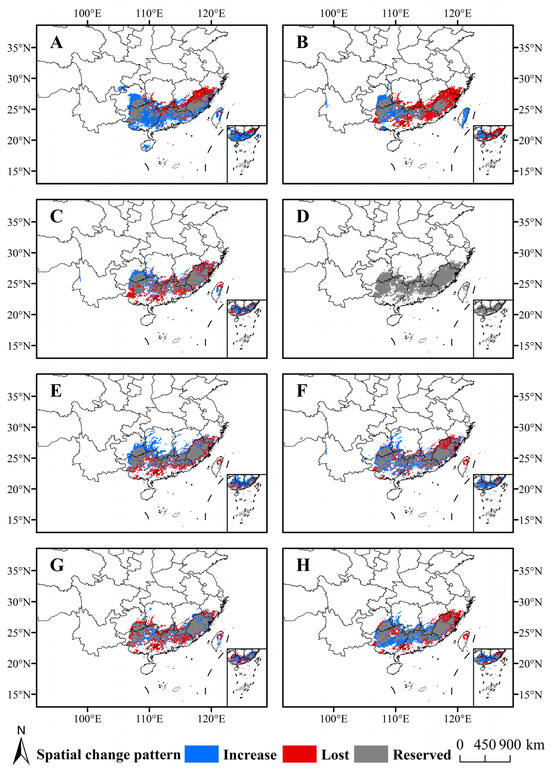 Spatial change patterns of potential suitable areas of O. microphylla in different periods. (A) Last interglacial; (B) last glacial maximum; (C) Middle Holocene; (D) current; (E) 2050s-SSP126; (F) 2050s-SSP585; (G) 2090s-SSP126; (H) 2090s-SSP585.