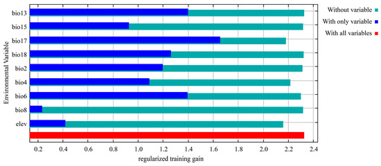 We analyzed the influence of climatic factors on the habitat suitability of O. microphylla using the contribution rate and permutation importance value (Table 4). The results showed that the top three climatic factors in terms of contribution rate to the MaxEnt model were bio17 (53%), bio4 (17.3%) and bio6 (11.3%). The cumulative contribution rate was 81.6%. Permutation importance values measure the degree of dependence of the model on environmental factors [27]. The top rankings were shown by bio17 (46.3%), bio6 (24.4%), and elev (13.4%). In the regularization training gain of the Jackknife test (Figure 6), when only one variable is used, the highest gain is observed with bio17. This indicates that bio17 contains the most useful information in the model construction. The environmental variable that exhibits the greatest decrease in gain when omitted is elev, suggesting that it possesses the most unique information not found in other environmental variables. Therefore, the dominant factors affecting the modern geographical distribution pattern of O. microphylla include bio17, bo4, bio6 and elev.