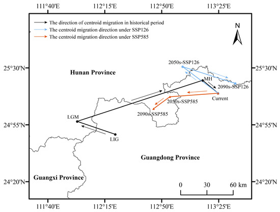 Figure 7 shows that in the three historical periods (LIG, LGM, and MH), the centroids of the suitable areas of O. microphylla are located in Lianzhou City, Qingyuan City, Guangdong Province (112°21′26.95″ E, 24°49′7.82″ N), Mashi Town, Jianghua Yao Autonomous County, Yongzhou City, Hunan Province (111°58′0.78″ E, 24°57′6.58″ N), and Liangjiang Town, Lechang City, Shaoguan City, Guangdong Province (113°15′11.64″ E, 25°22′21.77″ N). The centroid of the current suitable distribution area is located in Wushan Town, Lechang City, Shaoguan City, Guangdong Province (113°24′39.88″ E, 25°14′26.23″ N). Under the SSP126 climate scenario, from the current era to the 2050s and then to the 2090s, the centroid of the suitable area of O. microphylla first migrated to the northwest by about 47.34 km to Wuling Town, Yizhang County, Chenzhou City, Hunan Province (113°2′51.05″ E, 25°30′42.54″ N), and then to the southeast by 57.52 km to Xiaoyuan Town, Rucheng County, Chenzhou City, Hunan Province (113°35′14.61″ E, 25°20′26.58″ N). At the same time, under the SSP585 climate scenario, from the current period to the 2050s and then to the 2090s, it is predicted that the centroid of the suitable area of O. microphylla will move to the southwest as a whole. It will first transfer about 50.01 km to Xietang Town, Yizhang County, Chenzhou City, Hunan Province (112°54′59.10″ E, 25°12′13.50″ N), and then transfer about 21.61 km to Dongfeng Township, Yizhang County, Chenzhou City, Hunan Province (112°44′58.19″ E, 25°4′53.09″ N).