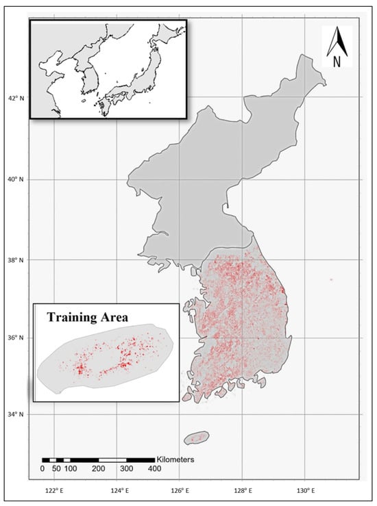 The study region—the Korean Peninsula consists of the Republic of Korea (ROK) and the Democratic People’s Republic of Korea (DPRK). Jeju Island in the south of ROK was used in this study as the training area (inset box) where the red areas represent the ground-truth planted forest data obtained from the national government records.