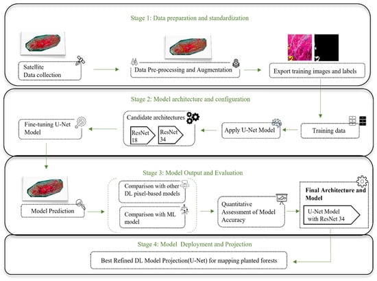 Our methodology comprised two main steps: a geospatial approach and a deep learning approach. In the geospatial approach, we compiled government-based in situ planted forest observations of 2020, and integrated them with extensive remote sensing imagery, allowing for a thorough geospatial mapping of planted forest regions. Subsequently, in the deep learning approach, we employed three different pixel-based deep learning models to train and analyze the compiled data. This synergetic approach, combining geospatial and deep learning methodologies utilizing ground truth data and remote sensing images, enabled a robust and comprehensive mapping of planted forest areas. To achieve this, we employed a four-stage process, as illustrated in Figure 2. In Stage 1, we acquired Sentinel-2 images at a 10 m resolution [51] from the summer and fall of 2020 using the Google Earth Engine (GEE) [52] for background imagery. These satellite imageries were merged to create a composite image overlaid with ground-truth data of planted forests from Jeju Island. We then applied comprehensive data cleaning and augmentation processes to ensure accuracy and reliability in our analysis. Firstly, we mapped the satellite data to ensure accurate alignment and consistency with the geographic coordinates of the ground-truth data. This involved overlaying the Sentinel-2 imagery with the ground-truth data to visually inspect and verify spatial congruence. Using ArcGIS 3.0.3, we matched the spatial extent of the imagery with the expected locations of planted forests, ensuring each data point corresponded accurately to its real-world position. Secondly, we conducted an outlier analysis by comparing the observed data points with the expected patterns of planted forests. Outliers were identified as data points that significantly deviated from the expected spatial distribution and were flagged using visual inspection [53]. To improve image quality, we incorporated the s2cloudless machine learning algorithm in the Google Earth Engine (GEE) [54,55] and further used data augmentation techniques to expand the training dataset [56,57,58]. These steps ensured that our dataset was clean, accurate, and reliable for subsequent analysis stages, enhancing the overall robustness of our study. Next, manual labeling was performed to identify and classify planted forests, and the processed and labeled data were exported for model training and testing. In Stage 2, we trained the UNet model [59] using different backbone architectures [60], including ResNet 18 and ResNet 34, with hyperparameter tuning [61] to determine the optimal settings. Stage 3 involved assessing the performance of the UNet model using various evaluation metrics and comparing it to other pixel-based deep learning models and the Random Forest ensemble machine learning model [62]. Based on the evaluation results, the UNet model with ResNet 34 backbone architecture was selected as the best-performing model for our mapping. Finally, in Stage 4, we used the optimized UNet model to project and map the extent of planted forests across the entire peninsula.
