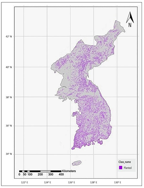 The Republic of Korea (ROK, also known as South Korea) is internationally recognized for its successful restoration of healthy forests after World War II and the Korean War, due to a series of planting efforts by the government [16,17]. Yet, the spatial coverage of the national data records remains unverified for the rest of the Korean Peninsula. Our knowledge of the exact locations of planted forests is limited, partly because (1) the decentralized responsibility for establishing and managing planted forests involving private entities, individual landowners, and small-scale enterprises often results in less formal reporting and data collection than in larger forested areas under state ownership [18], (2) the spatial distribution of planted forests across different jurisdictions creates complexities in implementing standardized monitoring systems, further impeding comprehensive data collection [19], and (3) historical research focus on natural forests has led to limited attention and resources allocated to documenting these man-made ecosystems [19]. The lack of consistent documentation hampers precise assessments of the extent, condition, and biodiversity of planted forests, which are vital for understanding their critical roles in carbon sequestration, biodiversity conservation, and sustainable resource management [20]. Without this information, it becomes challenging to make informed decisions that maximize the ecological, economic, and social benefits of these forests. Thus, a map that provides a complete projection of the geographic distribution of planted forests in the Republic of Korea is not just a step towards creating a consistent and harmonized product but also a vital tool in guiding effective environmental policy and forest management strategies. Failure to address this gap could lead to continued mismanagement, resulting in impaired ecosystem services and diminished carbon storage capacity, undermining efforts to combat climate change and preserve natural resources.
