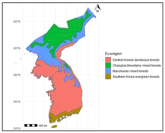 WWF terrestrial ecoregions of North and South Korea. The map illustrates the distribution of different ecoregions: Central Korean deciduous forests, Changbai Mountains mixed forests, Manchurian mixed forests, and Southern Korea evergreen forests.