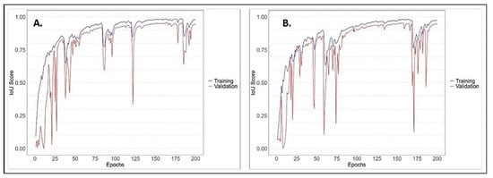 The Intersection over Union (IoU) scores of the proposed UNet model for the training and validation datasets on the Republic of Korean Peninsula, based on (A) Red-Green-Blue Band (B4, B3, B2) and Sentinel-2 10 m resolution background imagery; and (B) Near-InfraRed-Red-Green Band (B8, B4, B3) and Sentinel-2 10 m resolution background imagery.