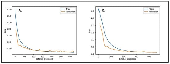 Another important aspect of evaluating a deep learning model’s performance is analyzing the loss curve, which also provides insights into the model’s performance [77]. The loss curve shows the trend of the model’s training and validation loss over the number of epochs or batches processed. This provides insights into how well the model learned from the training data and how well it generalizes to new data. A well-fitting loss curve decreases over the epochs and stabilizes at a point without overfitting or underfitting [77,78]. Therefore, the loss curve analysis is significant in determining if the model has learned efficiently from the training data and if it can perform well on new data.