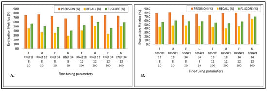 Evaluation metrics of the proposed UNet model of Jeju Island across different backbone architectures and hyperparameters (F-Freezing weights; U-Unfreezing weights; Batch (8; 12) Epochs (20; 200)), and two different band combinations: (A) Red-Green-Blue Band (B4, B3, B2) of Sentinel-2 10 m resolution background imagery; and (B) Near-InfraRed-Red-Green Band (B8, B4, B3) of Sentinel-2 10 m resolution background imagery.