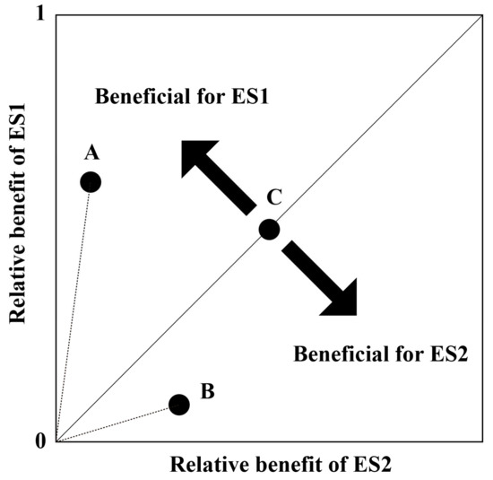 where ESi is the standardized value of the ith ecosystem function and ESexpi is the average value after standardizing the value of the ith ecosystem function. In addition, the degree of benefit between two ecosystem functions can be determined using the diagonal graphical method (Figure 1), where RMSD is expressed as the distance from the coordinates of the standardized values of a pair of ecosystem functions in dimensional space to the 1:1 line. In this method, when the angle with the vertical axis is greater than that with the horizontal axis, it indicates that the ecosystem function represented by the horizontal axis benefits more from the relationship, and vice versa. Furthermore, when the arrow lengths are the same, the angles between the arrow and the 1:1 line indicate which ecosystem function will be utilized (i.e., point A is more likely to utilize ES1 and point B is more likely to utilize ES2).
