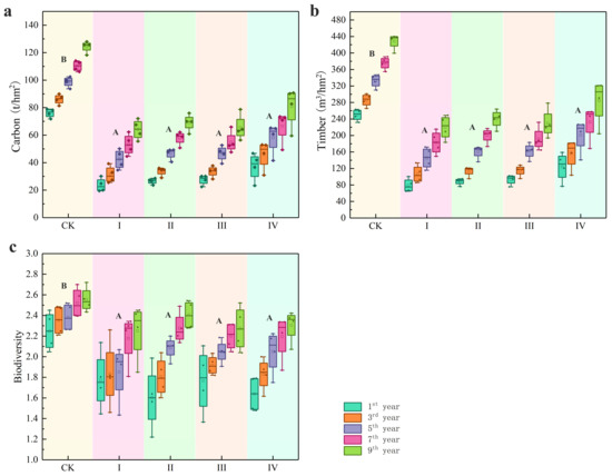 Carbon sequestration, timber production, and biodiversity in stands with different management measures. (a) Carbon sequestration in stands with different management measures. (b) Timber production in stands with different management measures. (c) Biodiversity in stands with different management measures. Note: Different letters (A and B) indicate significance of differences between different management measures (p < 0.05).