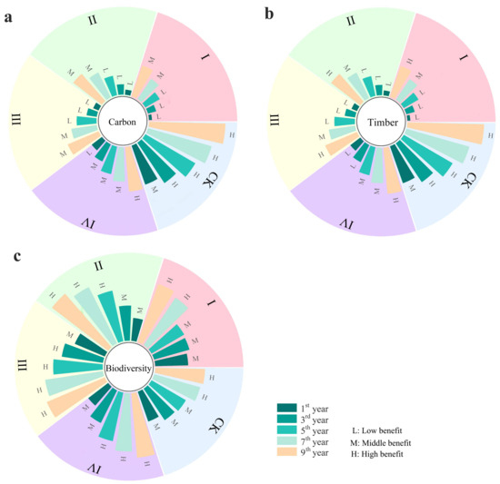 From the first to the ninth year of restoration, the relative benefits of timber production in the Management Measure I–IV stands all changed significantly and, with the exception of the Management Measure I stands, all of the management measure stands reached a high efficiency, while there was no change in the relative benefit of timber production in the control stand. Timber production in the Management Measure I–III stands increased from low benefit to medium benefit and high benefit, while in forest stands under Management Measure IV, the benefit increased from medium to high.