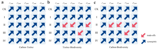In summary, the average annual growth rates in the composite function indices of the four different management measures were significantly higher than those of the control. In the first nine years of restoration, the management measure with a 65% harvesting intensity and replanting of various native broadleaf species was the most effective. This management measure produced relative benefits to timber production, carbon sequestration, and biodiversity at or above the medium level of effectiveness. Furthermore, its dominant ecosystem function tended toward biodiversity over time. This management measure sustained synergistic relationships between pairs of ecosystem functions over time, while both trade-off and synergistic relationships were observed between pairs of ecosystem functions in the other three management measure stands.