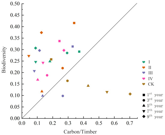 This study showed that different stand management measures had varied effects on the forest ecosystem. The management measure that had a harvesting intensity of 65% and replanted a variety of native broadleaf species had particularly significant effects. During years one to nine of restoration, the volume and carbon sequestration of the stands under the four management measures were significantly lower than those of the control stands. This may have been because the harvesting intensities in the managed stands in this study were all greater than 65%, qualifying as high-intensity harvesting. The densities of the retained wood in the stands were lower than that of the control stand, while the growth of the replanted native broadleaf species was also predominantly characterized by the presence of fast-growing broadleaf species and slow-growing broadleaf species. There was a large difference between the growth rates of the two categories of species, which resulted in the short-term timber production and carbon sequestration performances being relatively poor and also clearly indicated that the high-intensity harvesting measures disturbed the forest stands. Harvesting trees creates relatively large disturbances in forest stands, but suitable anthropogenic actions (e.g., replanting and nurturing) can facilitate the recovery of the forest stand to reestablish a stable high-level community and achieve ecosystem equilibrium in the shortest time possible [26,39]. The control group in this paper had the highest carbon, timber, and biodiversity values over the 10-year period, which may be due to the fact that the study diversity metrics were selected primarily for size diversity, which was influenced by stand growth, and that there were differences in the response of replanted fast-growing and slow-growing broadleaf species to varying harvesting intensities and in the competitive relationships among individual single-timber trees.